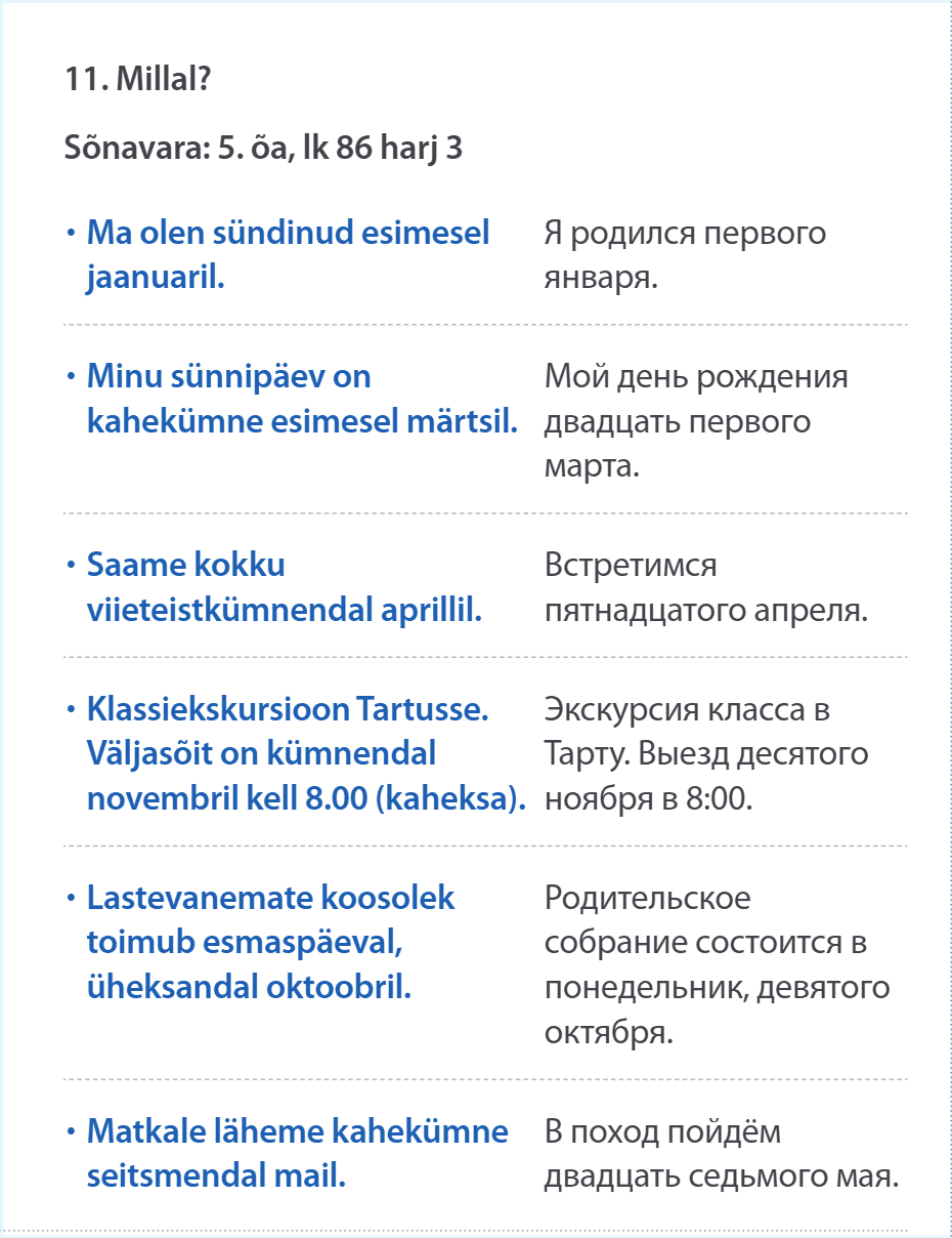 11. Millal? Sõnavara: 5. õa, lk 86 harj 3