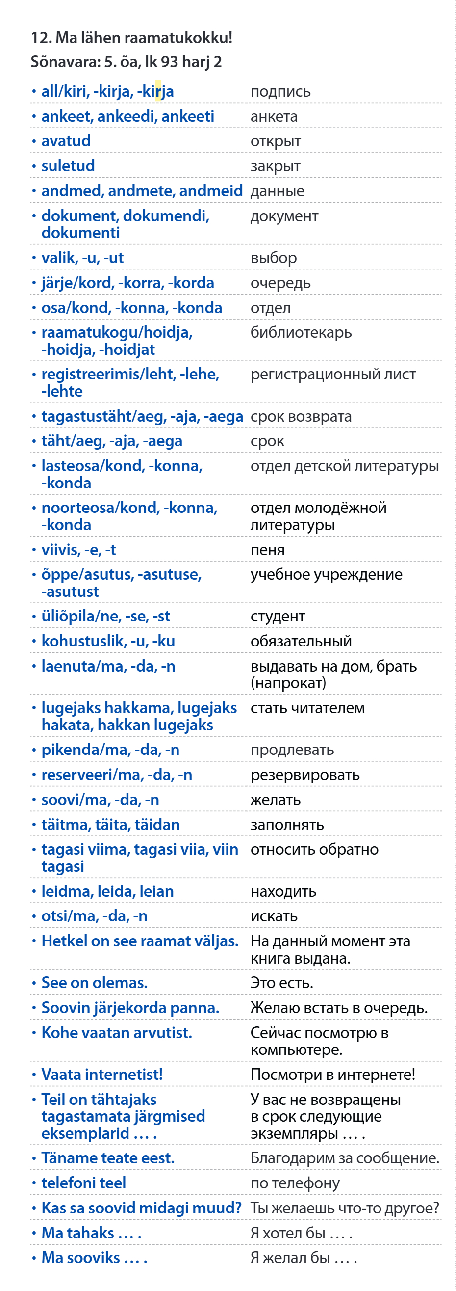 12. Ma lähen raamatukokku! Sõnavara: 5. õa, lk 93 harj 2