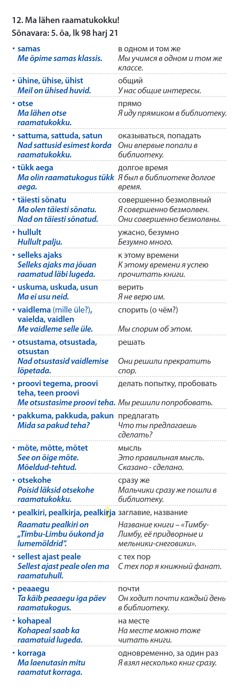 12. Ma lähen raamatukokku! Sõnavara: 5. õa, lk 98 harj 21