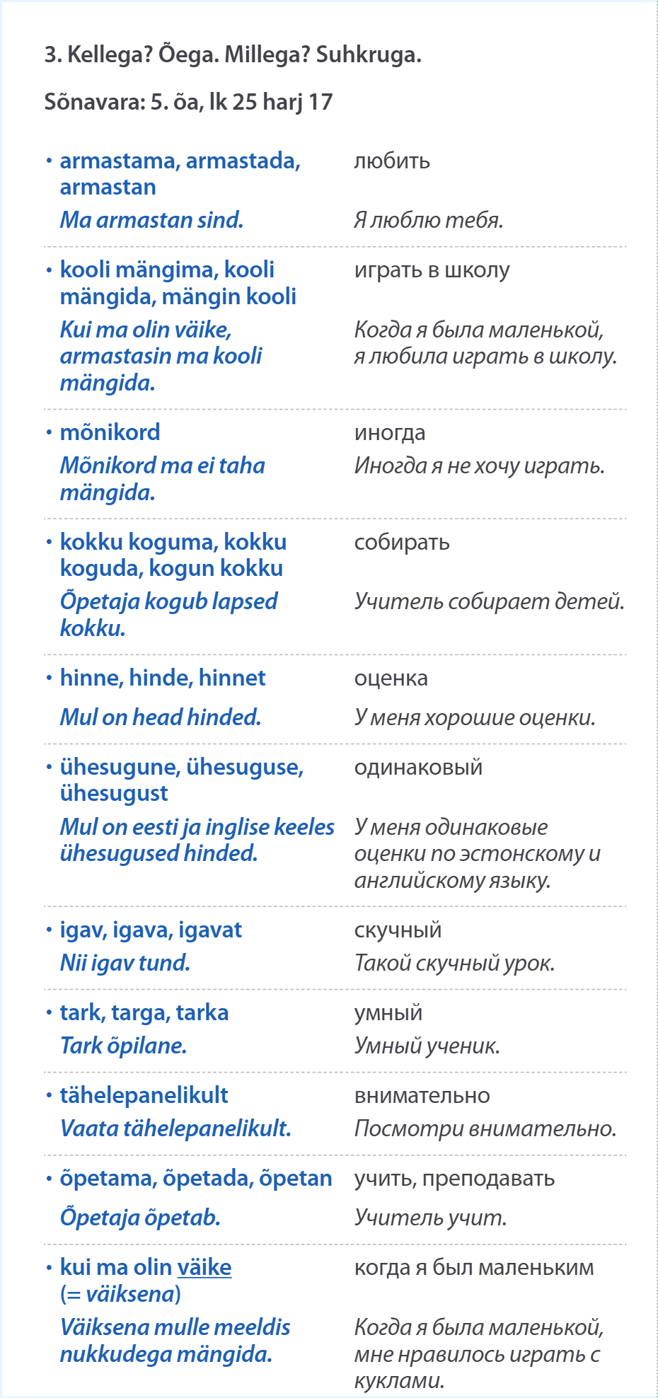 3. Kellega? Õega. Millega? Suhkruga. Sõnavara: 5. õa, lk 25 harj 17