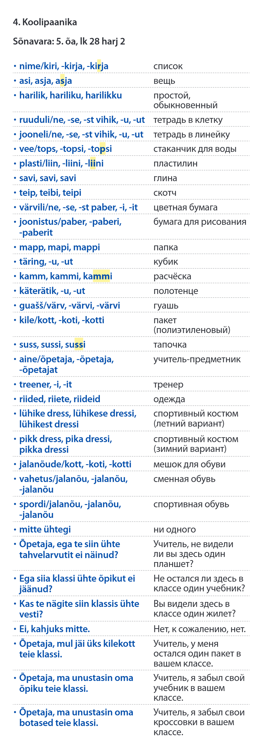 4. Koolipaanika Sõnavara: 5. õa, lk 28 harj 2