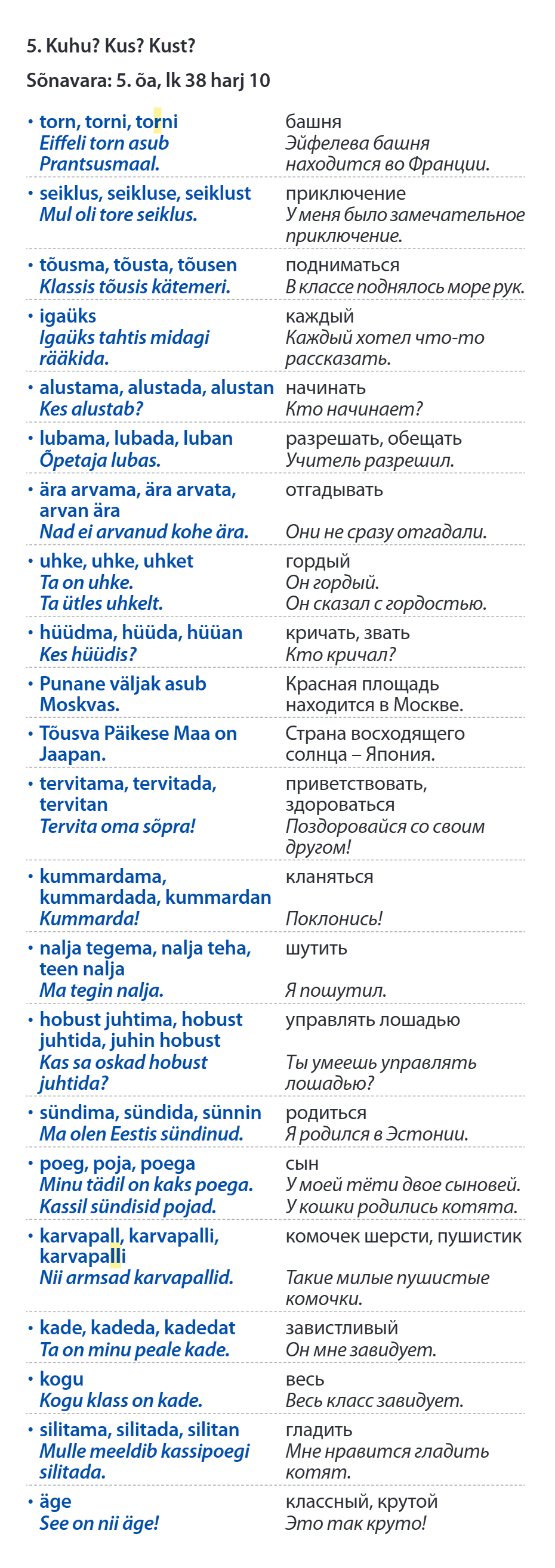 5. Kuhu? Kus? Kust? Sõnavara: 5. õa, lk 38 harj 10