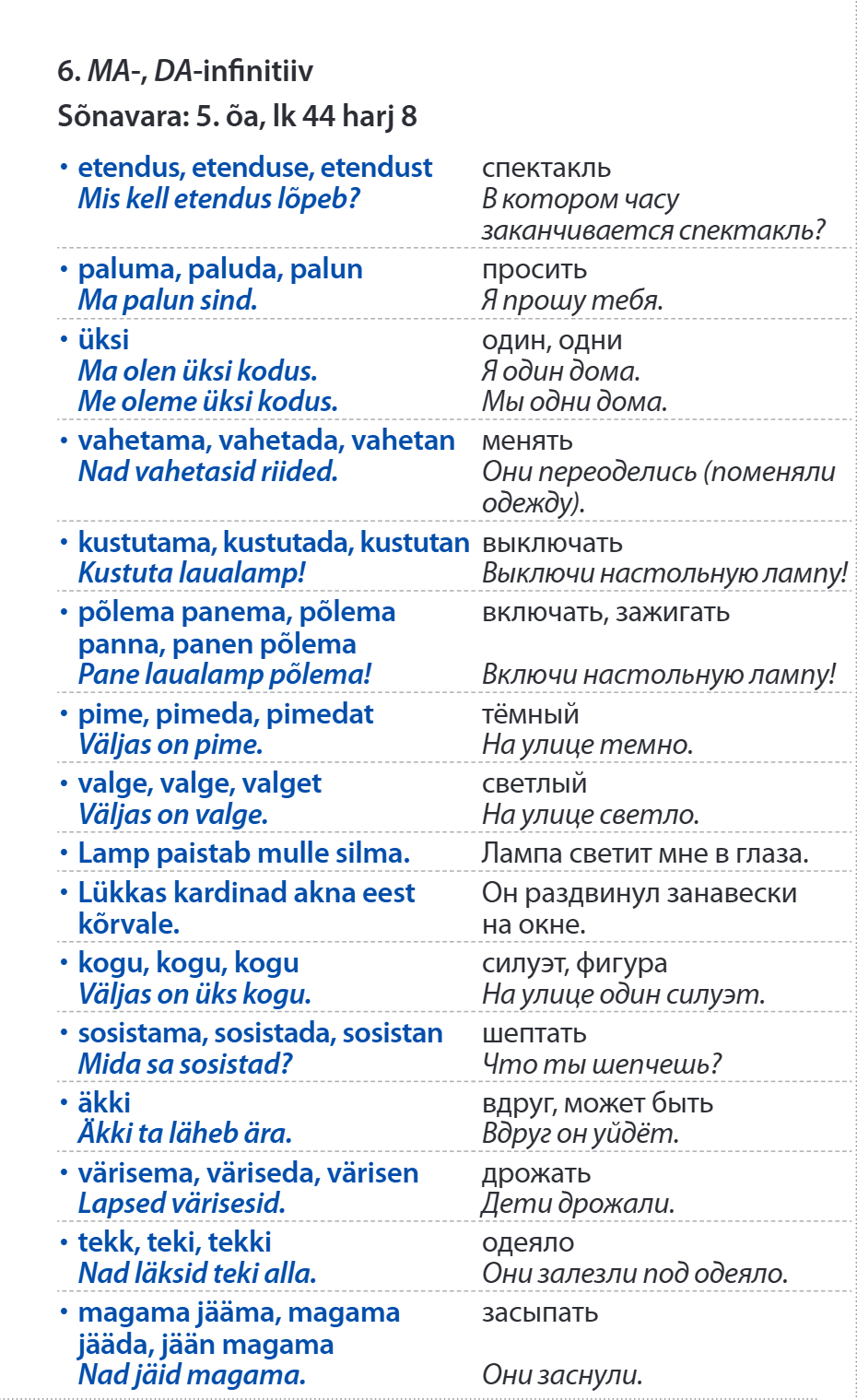 6. MA-, DA-infinitiiv Sõnavara: 5. õa, lk 44 harj 8