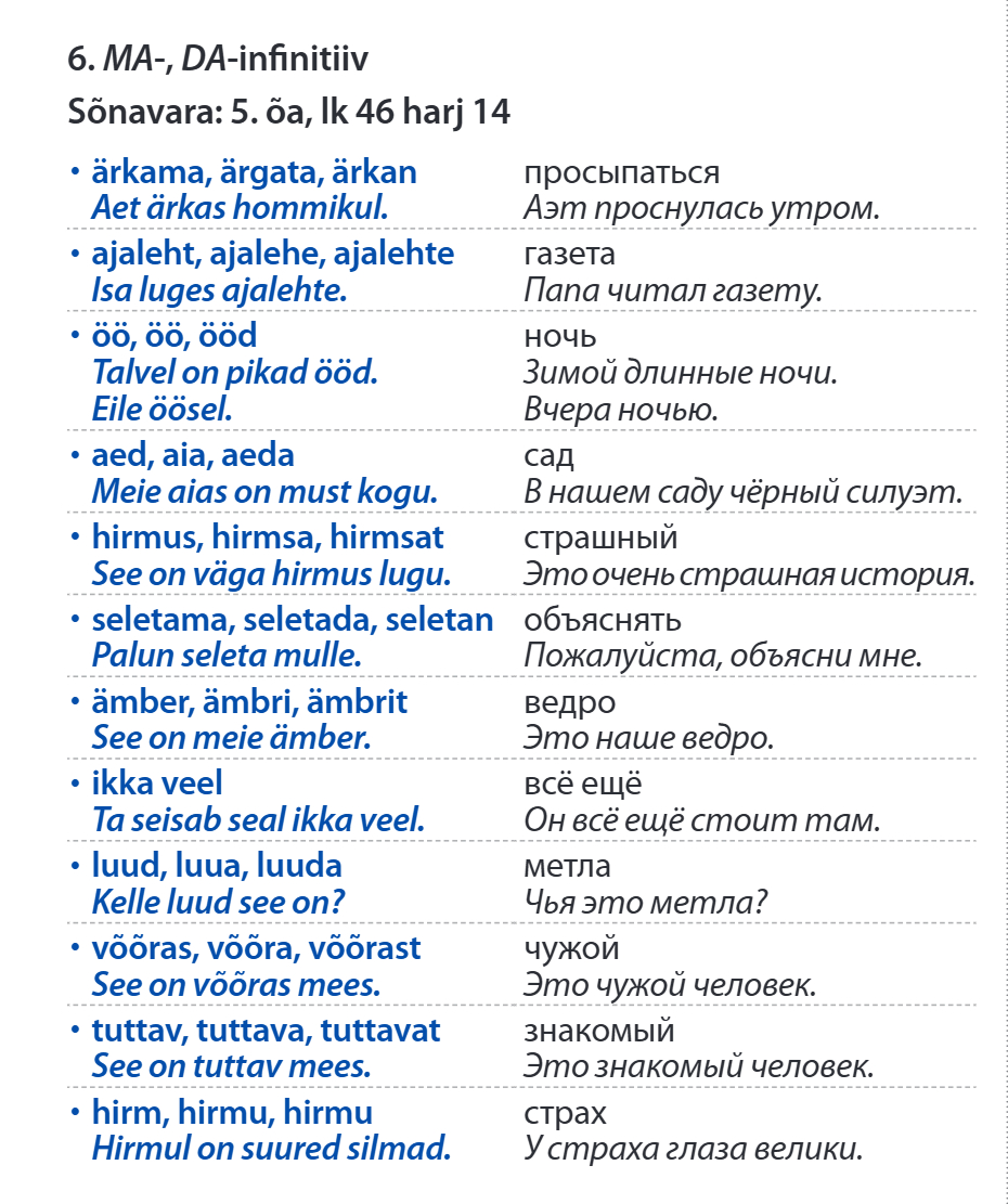 6. MA-, DA-infinitiiv Sõnavara: 5. õa, lk 46 harj 14