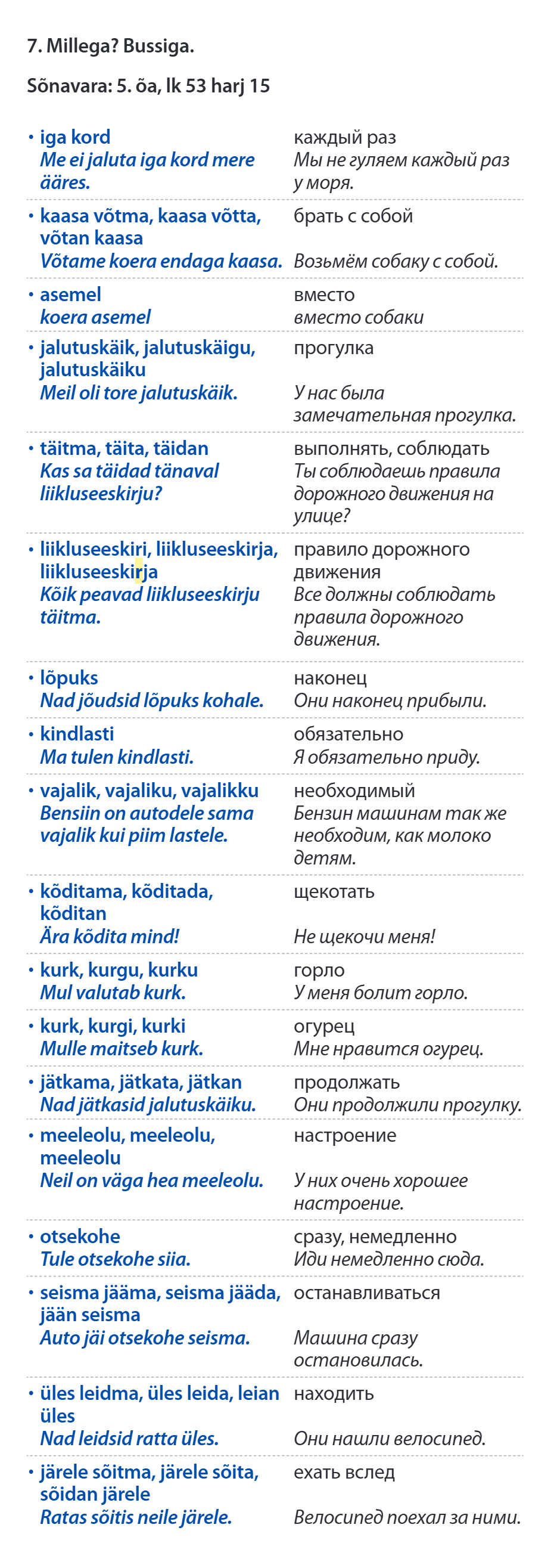 7. Millega? Bussiga. Sõnavara: 5. õa, lk 53 harj 15