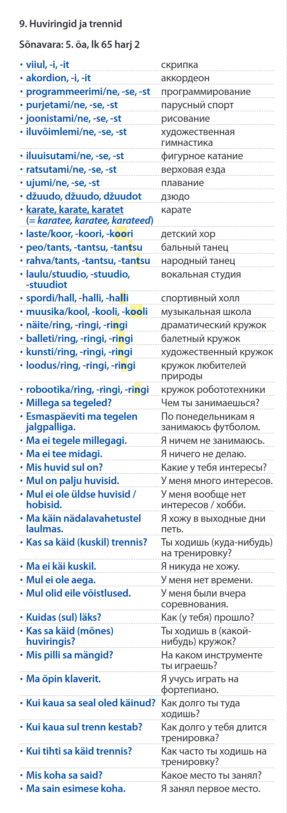 9. Huviringid ja trennid Sõnavara: 5. õa, lk 65 harj 2