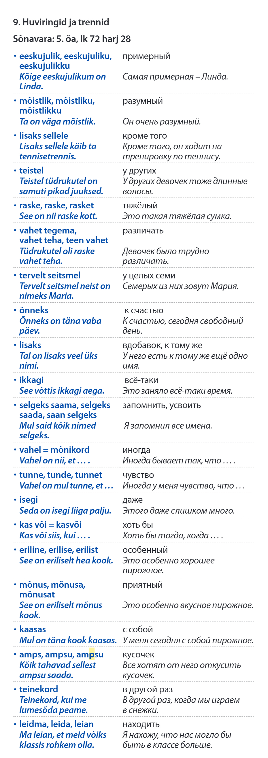 9. Huviringid ja trennid Sõnavara: 5. õa, lk 72 harj 28