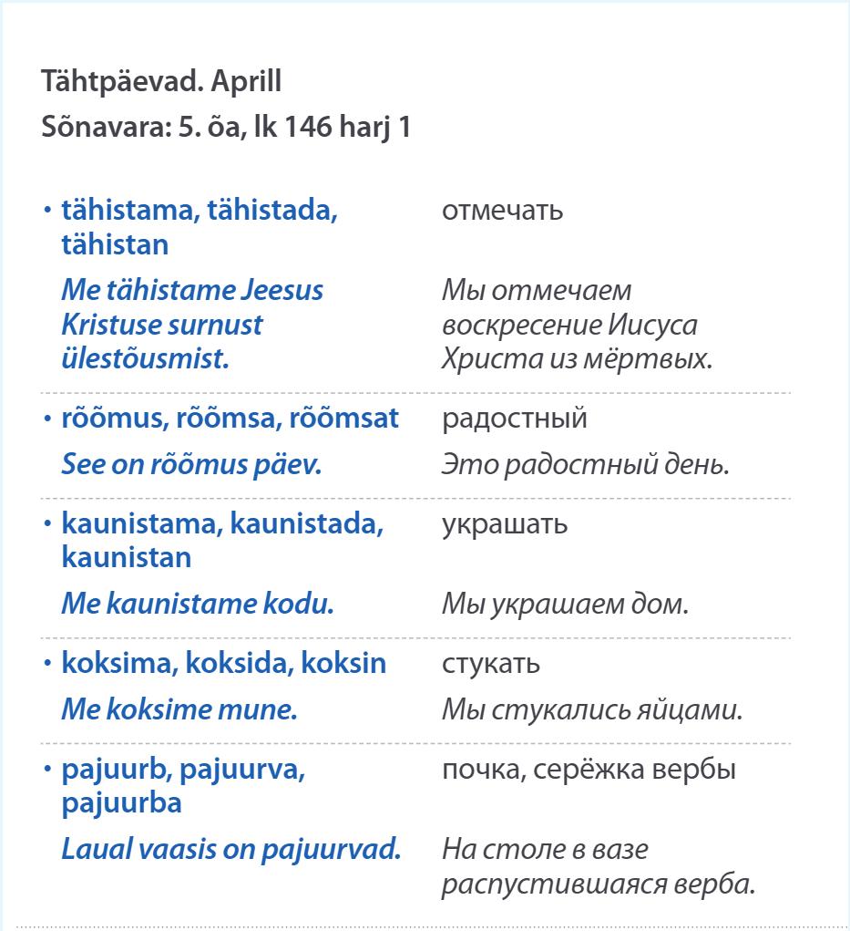 Tähtpäevad. Aprill Sõnavara: 5. õa, lk 146 harj 1