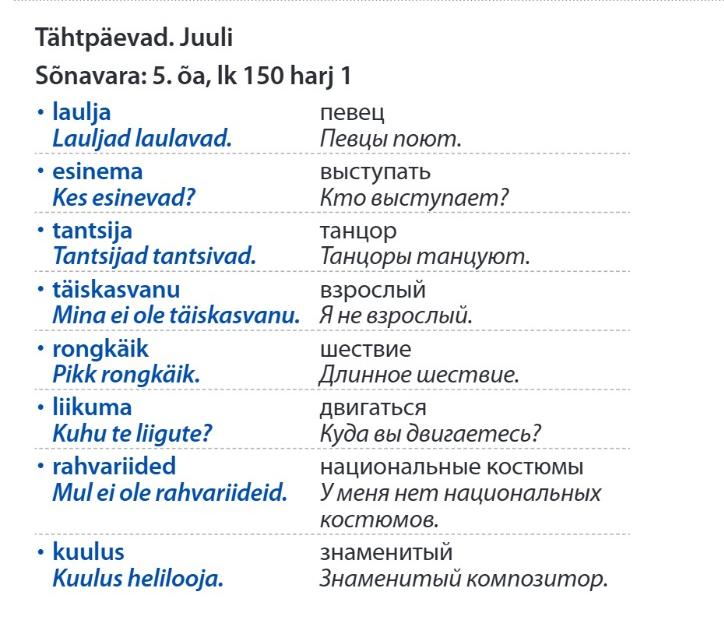 Tähtpäevad. Juuli Sõnavara: 5. õa, lk 150 harj 1