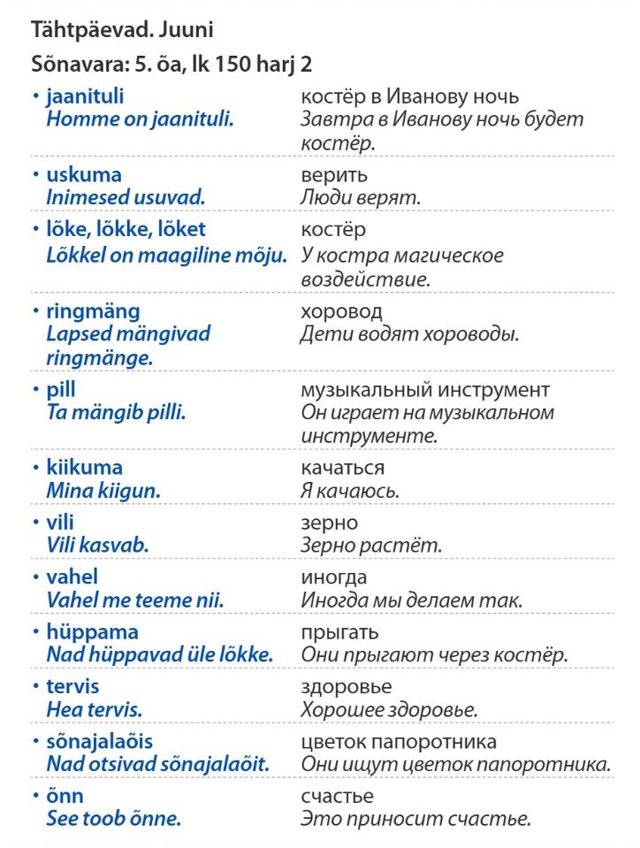 Tähtpäevad. Juuni Sõnavara: 5. õa, lk 150 harj 2