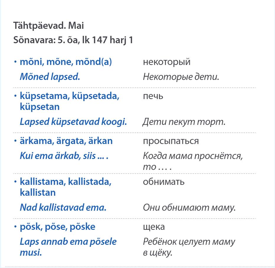 Tähtpäevad. Mai Sõnavara: 5. õa, lk 147 harj 2