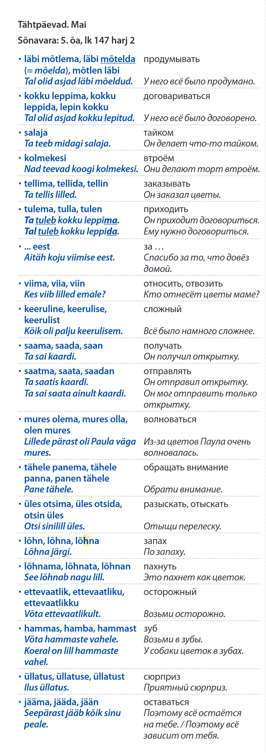 Tähtpäevad. Mai Sõnavara: 5. õa, lk 147 harj 1