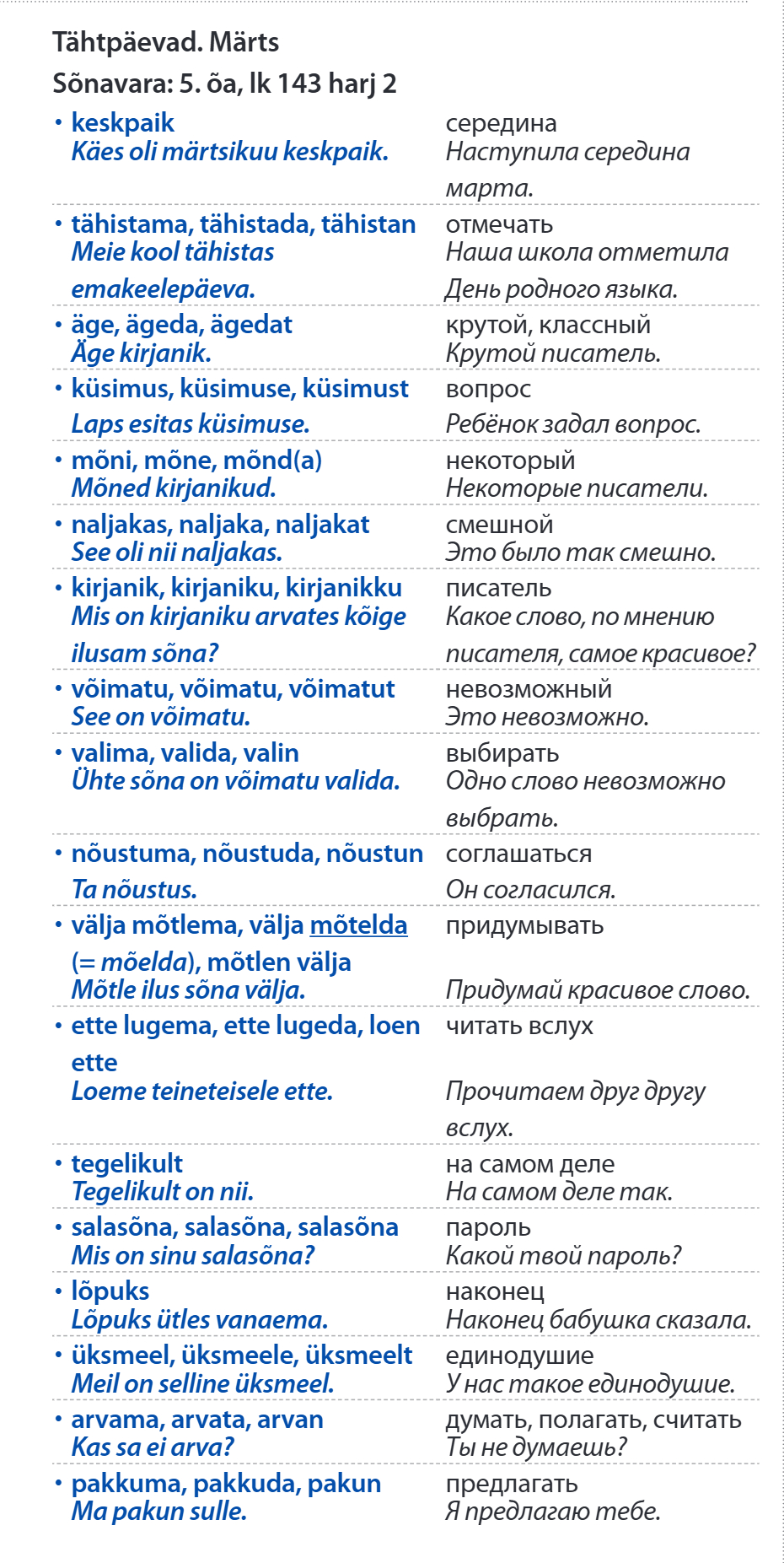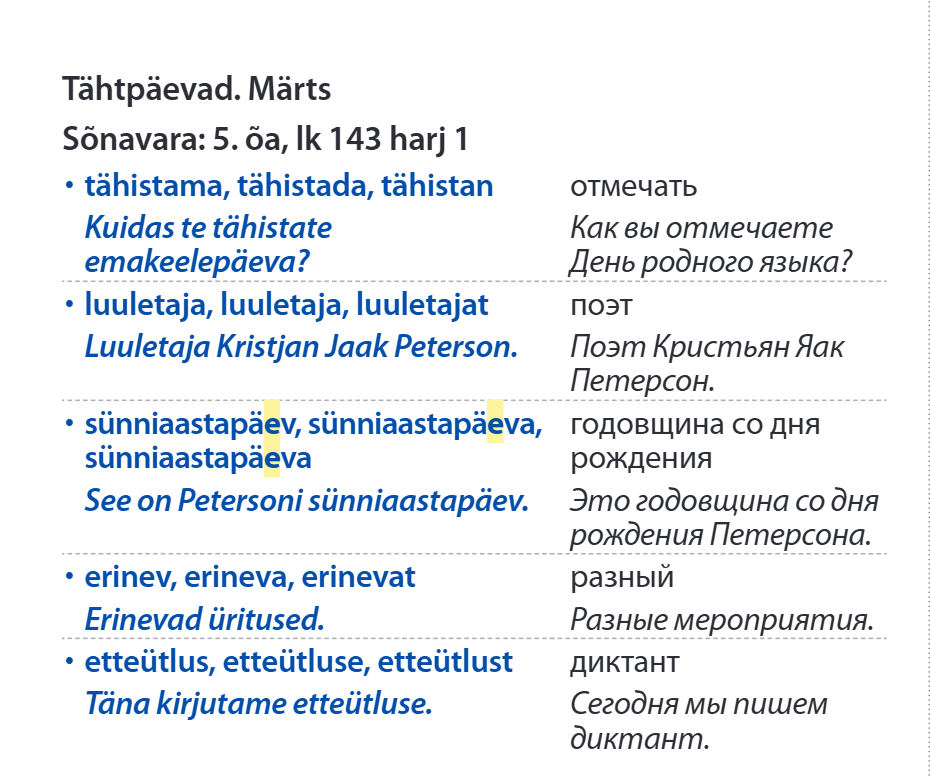 Tähtpäevad. Märts Sõnavara: 5. õa, lk 143 harj 2