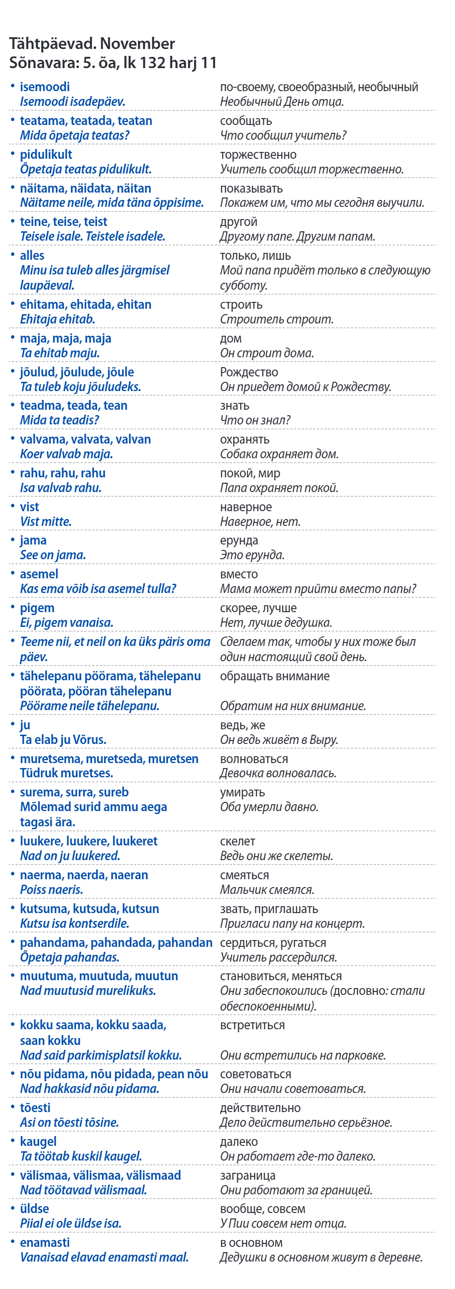 Tähtpäevad. November Sõnavara: 5. õa, lk 132 harj 11