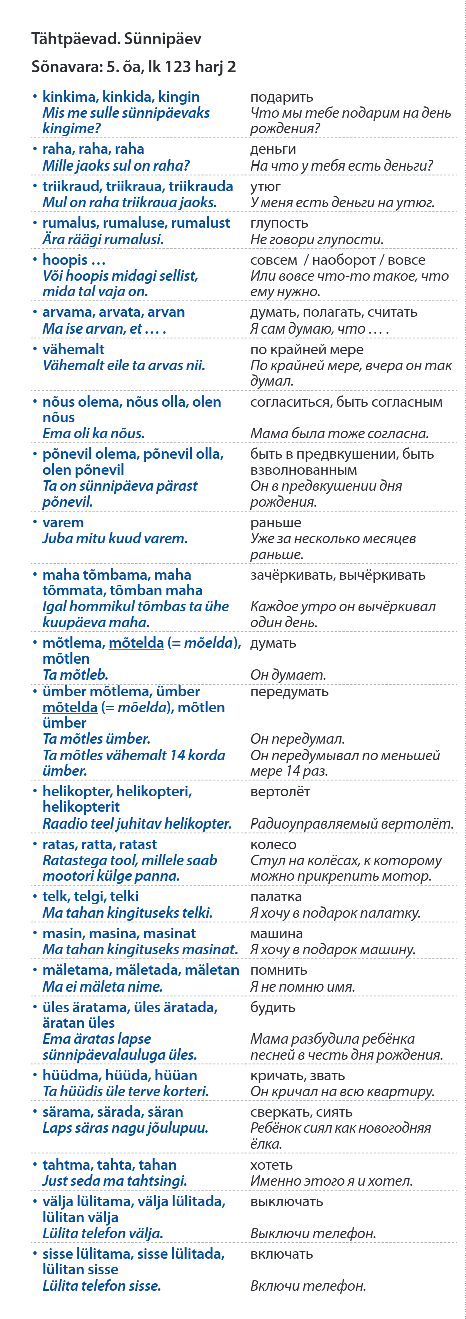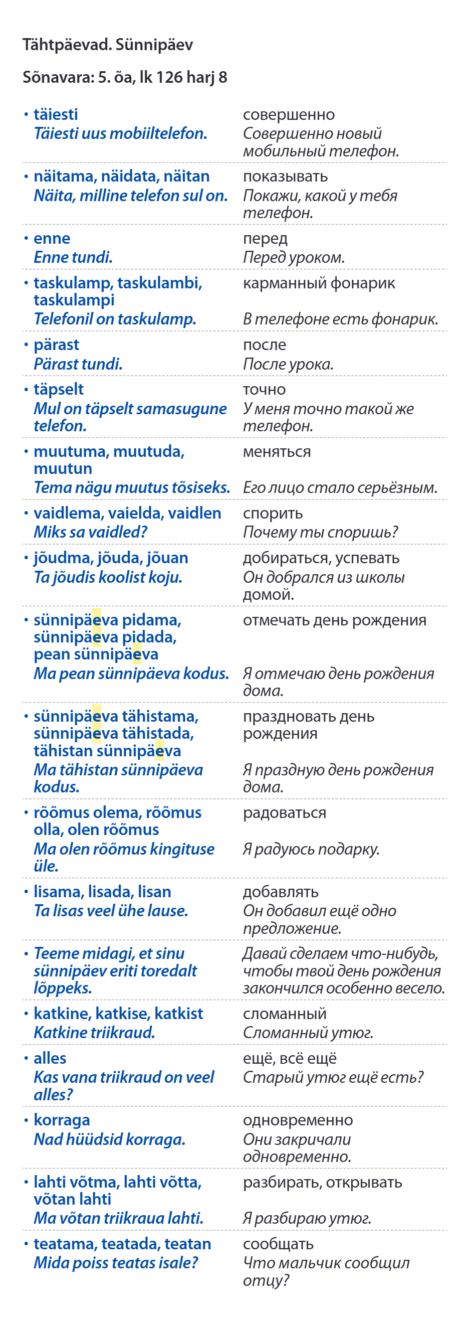 Tähtpäevad. Sünnipäev Sõnavara: 5. õa, lk 126 harj 8