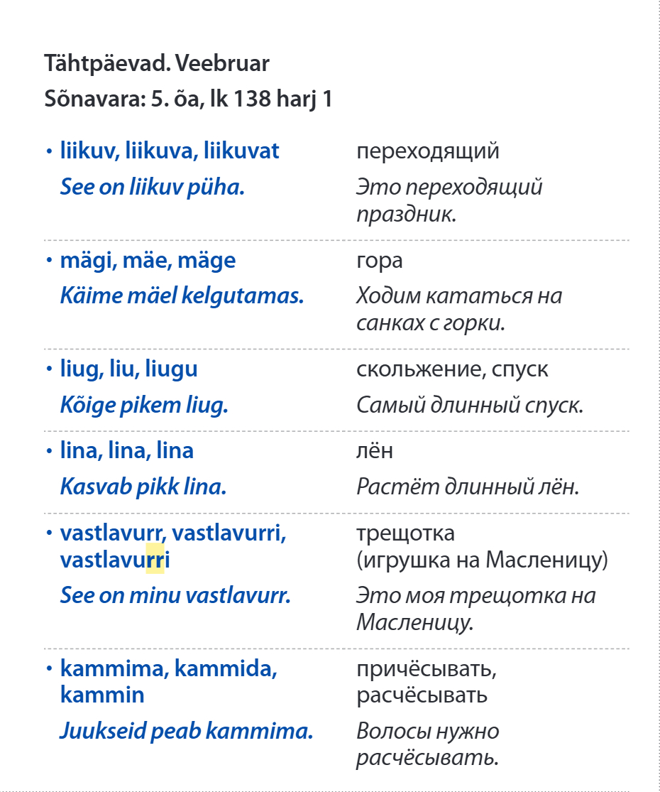 Tähtpäevad. Veebruar Sõnavara: 5. õa, lk 138 harj 1